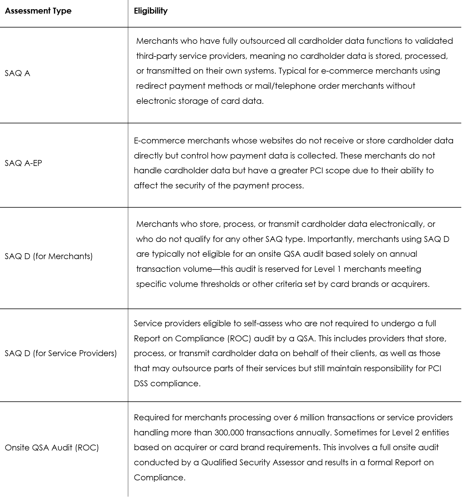 For merchants, this reduced scope often aligns with the SAQ A, the shortest and least burdensome PCI DSS assessment. Even Level 1 merchants — those processing over 6 million transactions annually — can benefit from this approach. While Level 1 merchants are typically required to undergo a Report on Compliance (ROC) conducted by a Qualified Security Assessor (QSA), the ROC’s scope can be limited to the minimal set of controls applicable to an SAQ A environment, typically around 26 requirements in PCI DSS v4.0.1, while the remaining requirements are considered as not applicable.